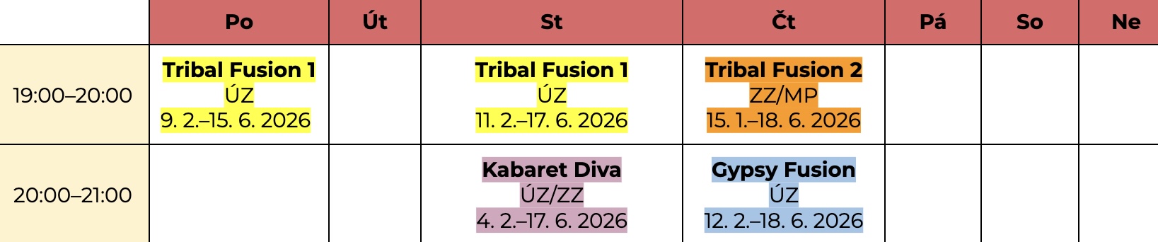 Rozvrh kurzů 2026 – Studio Andrea: